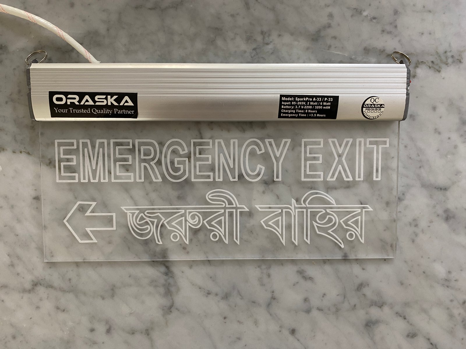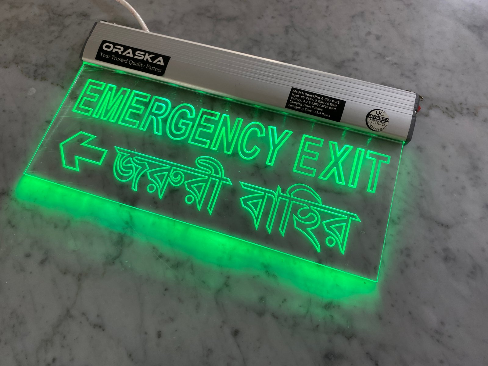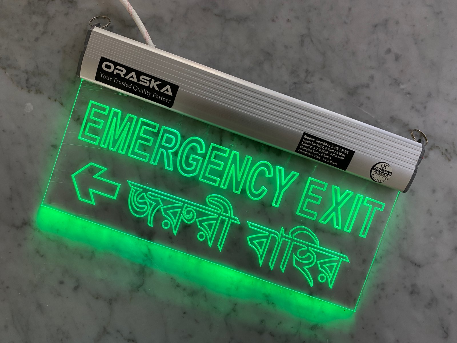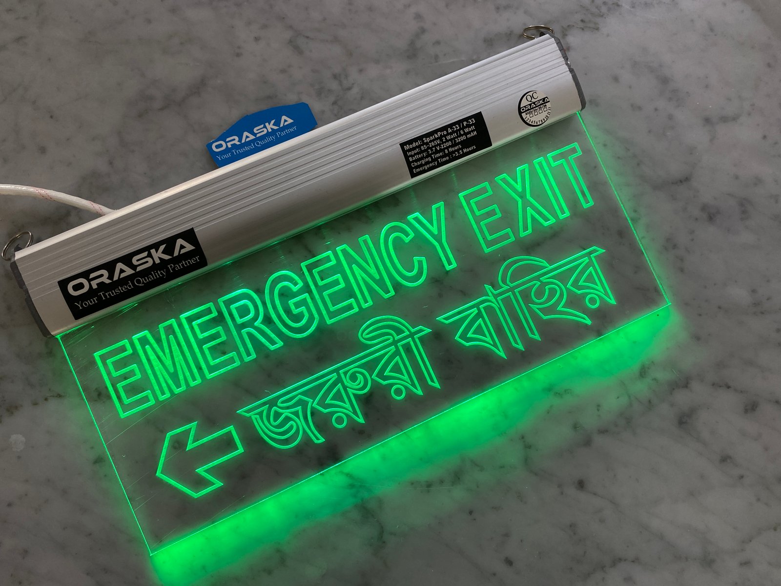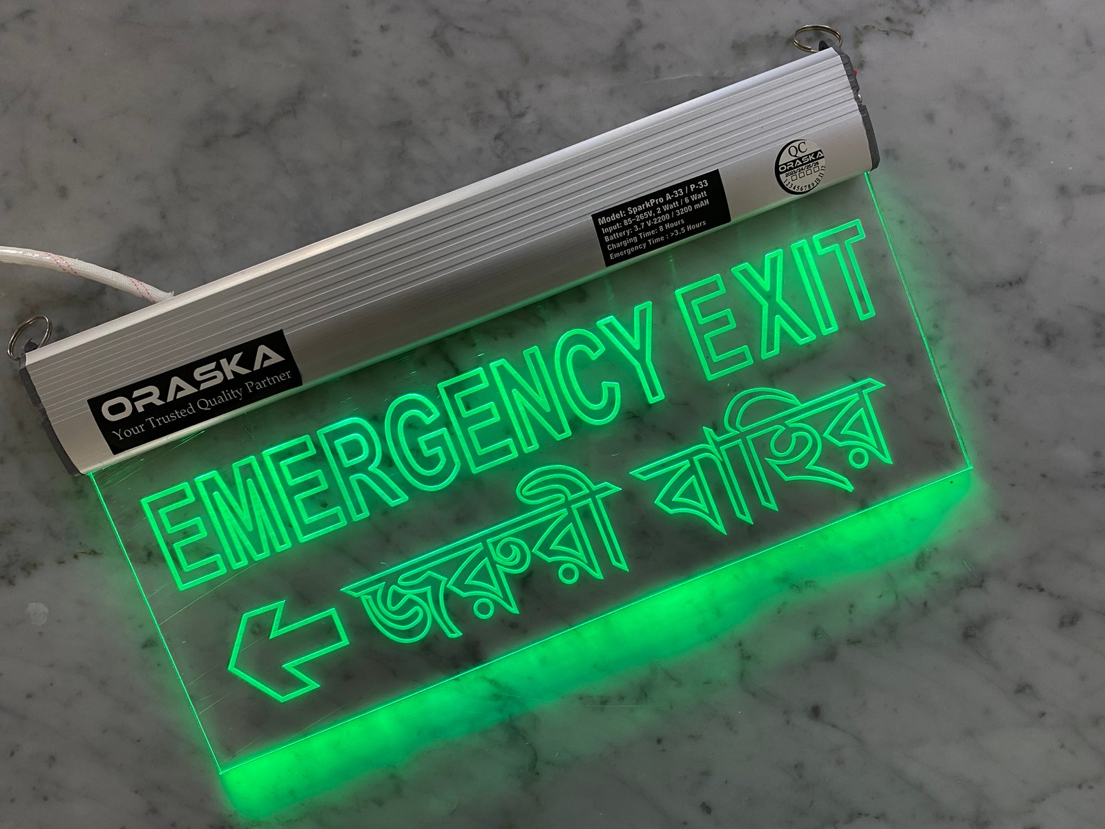 The ORASKA SparkPro A-33 Clear Exit Sign Light is a compact, premium-grade emergency signage solution, crafted with precision for modern safety compliance. Its single-sided clear engraved acrylic panel with aluminum channel body ensures sleek design, high durability, and crystal-clear visibility.