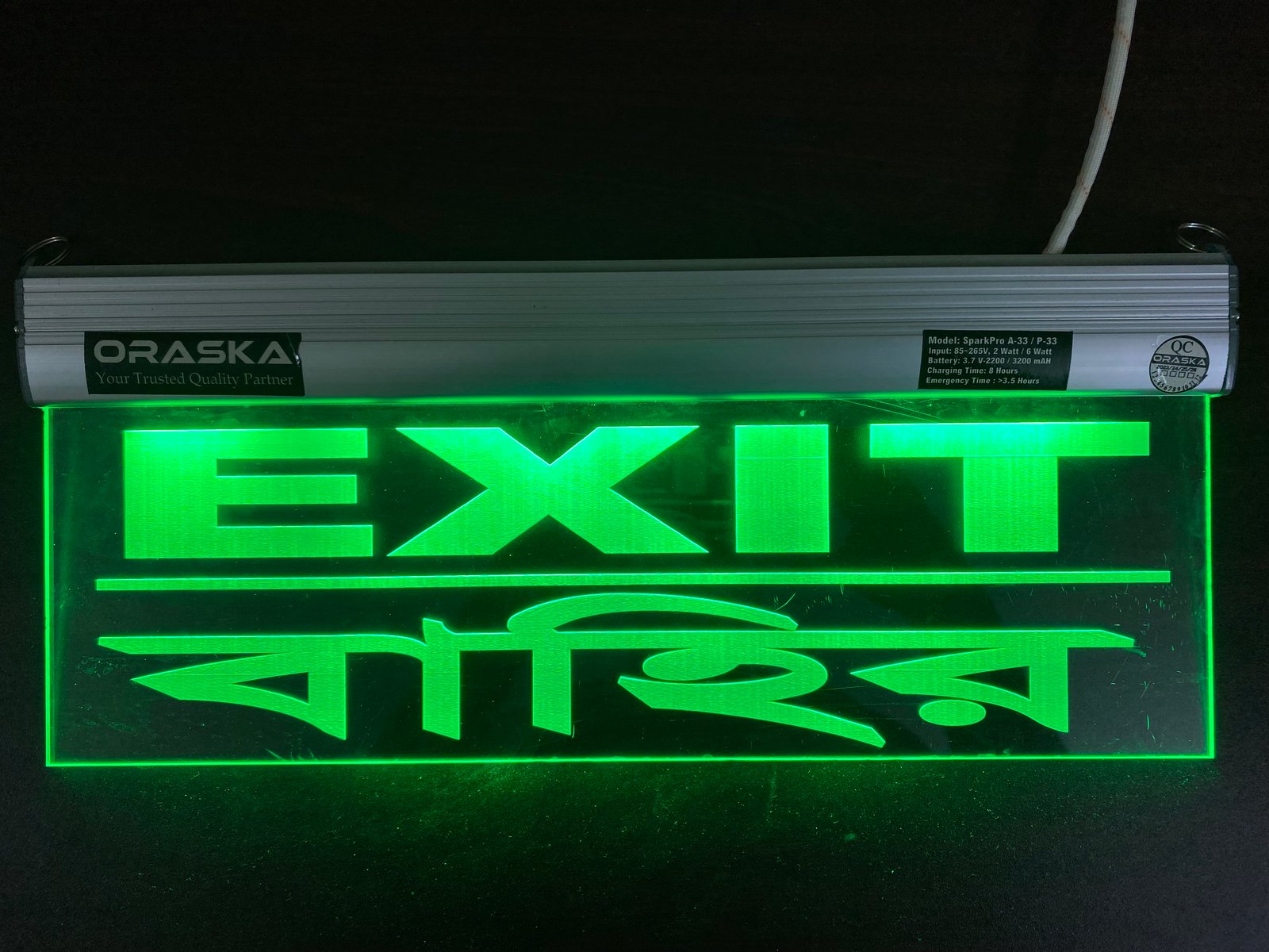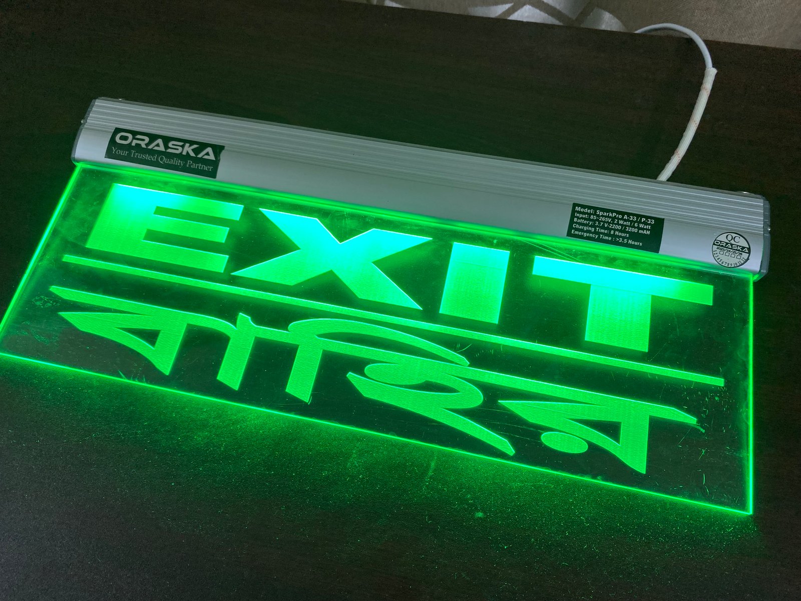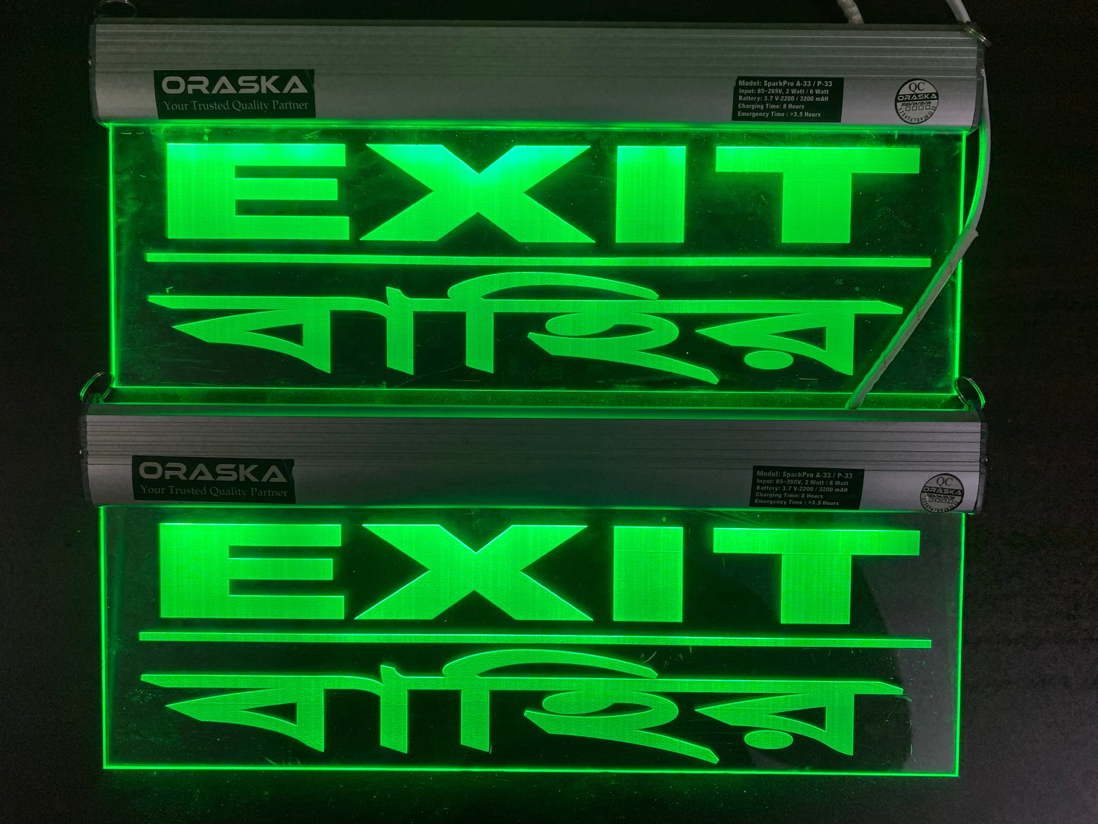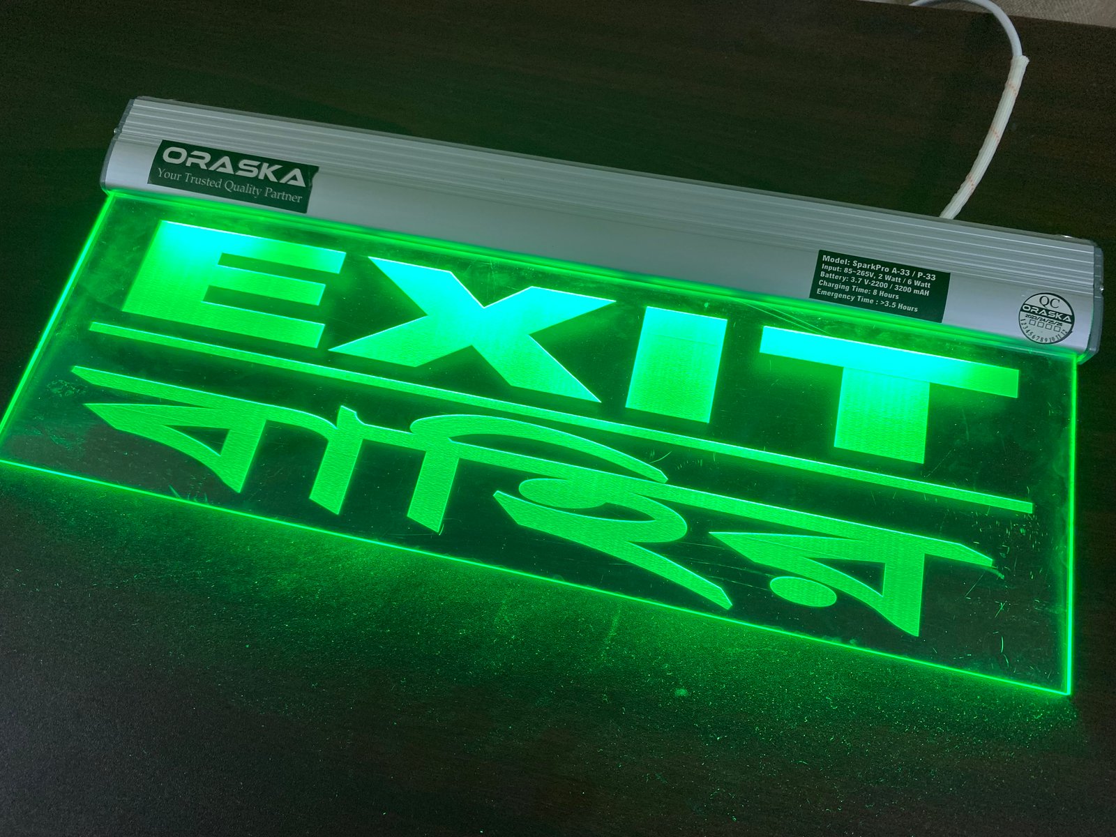 The ORASKA SparkPro A-33 MEGA Clear Exit Sign Light is a compact, premium-grade emergency signage solution, crafted with precision for modern safety compliance. Its single-sided clear engraved acrylic panel with aluminum channel body ensures sleek design, high durability, and crystal-clear visibility.
