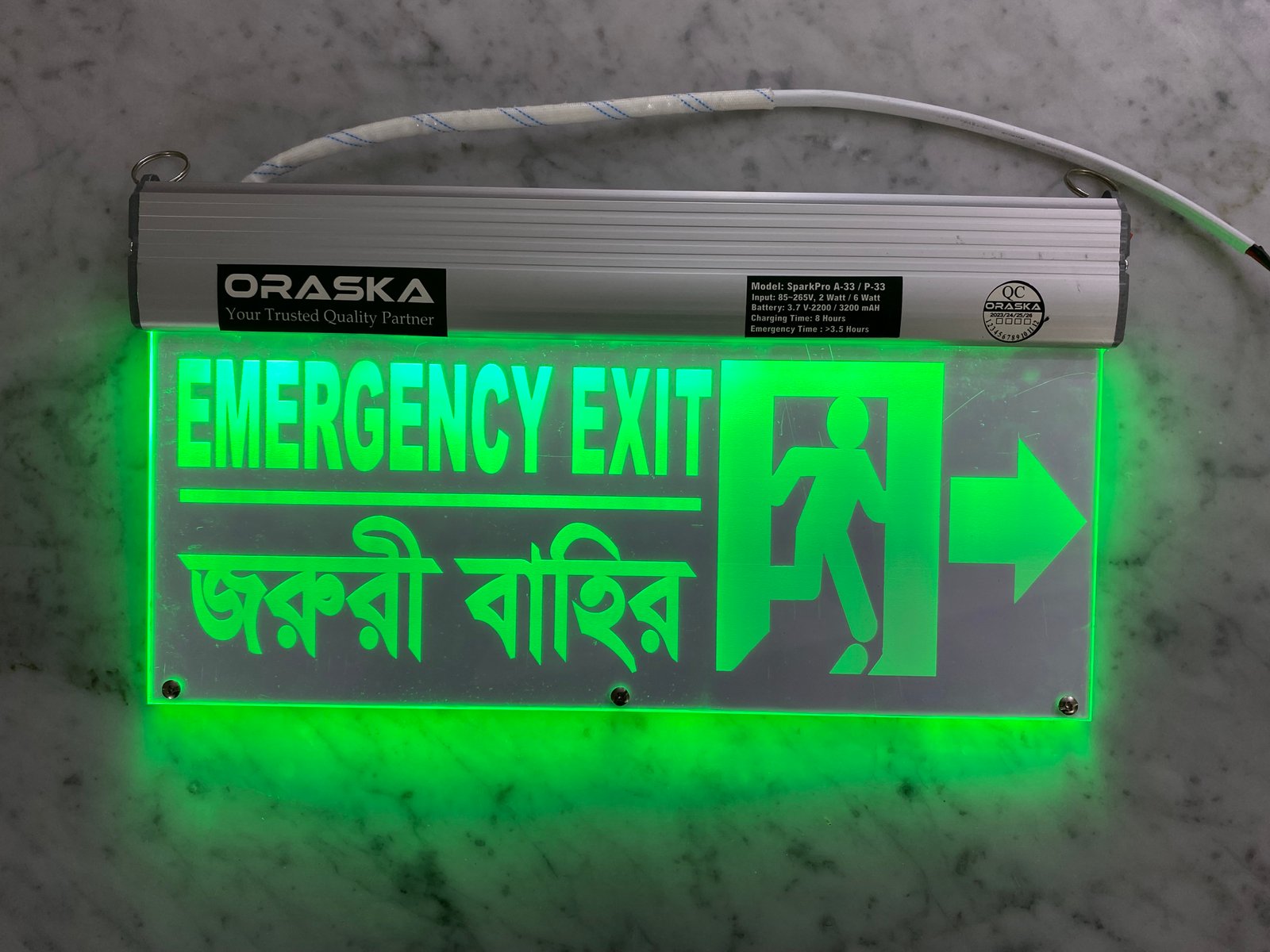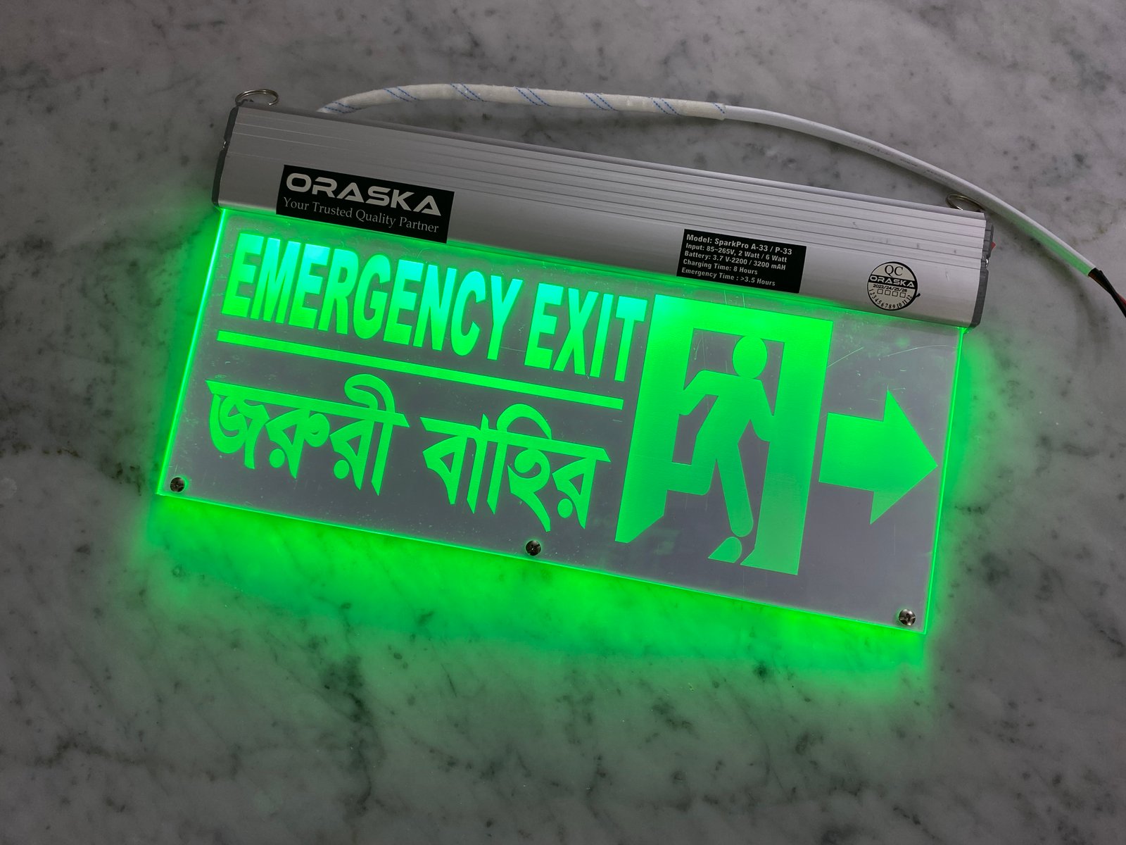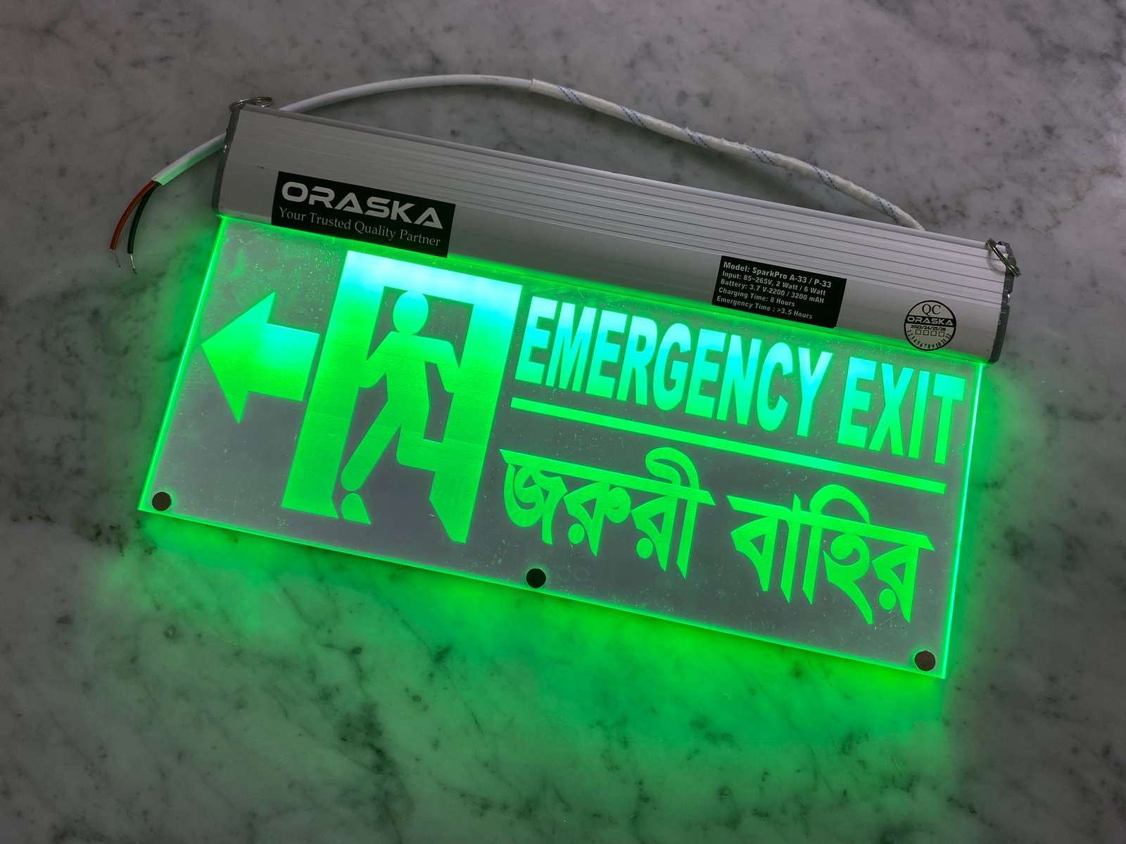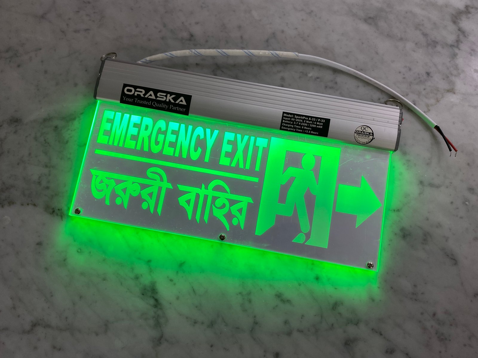 The ORASKA SparkPro AA-33 Smart Color Contrast Exit Sign Light is a premium-grade emergency signage solution, designed with 3-layer acrylic construction for maximum clarity, durability, and safety compliance. Its unique build features a green acrylic middle sheet sandwiched between two clear acrylic sheets, both machine-engraved on opposite faces to produce a crystal-clear and highly visible exit sign from both directions.