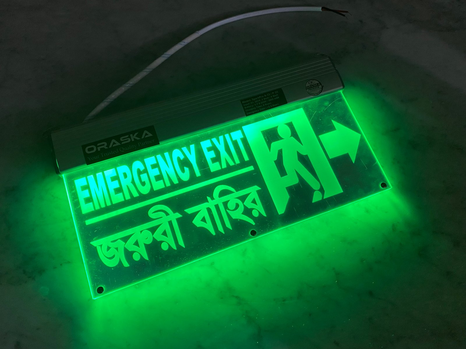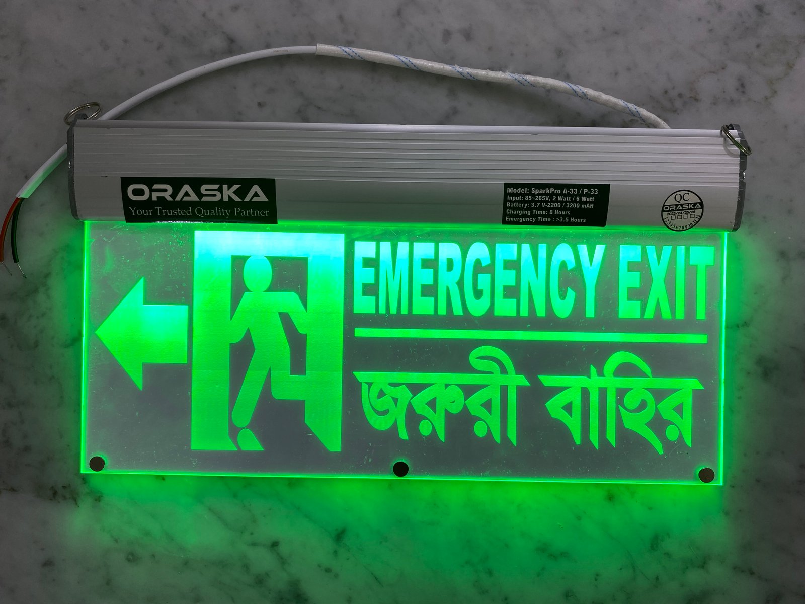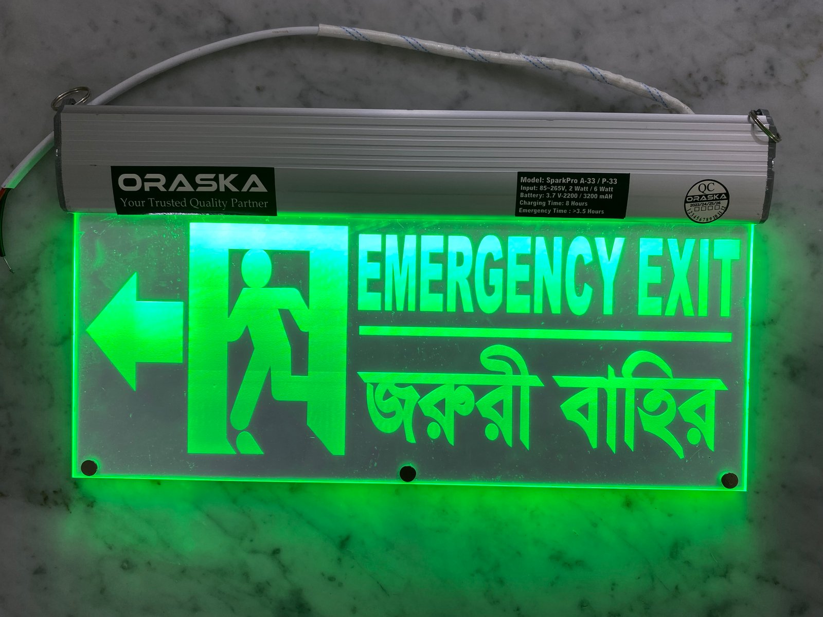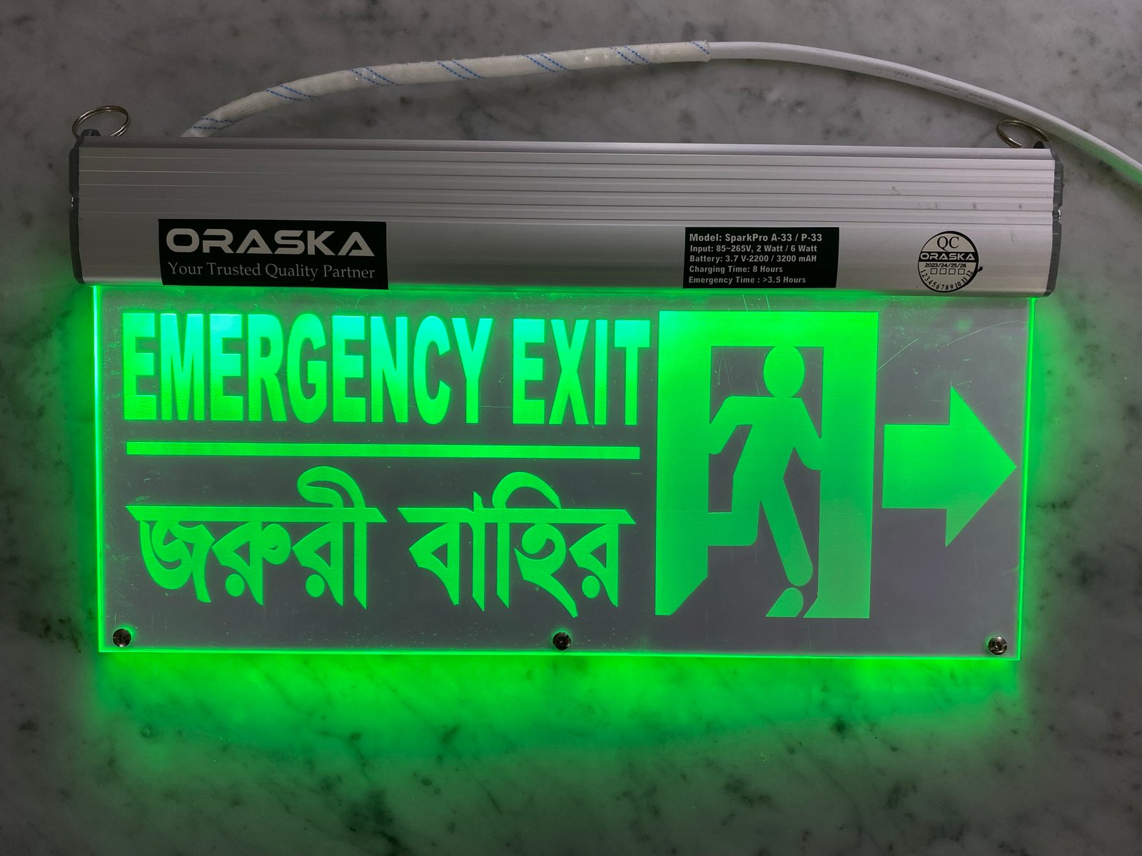 The ORASKA SparkPro AA-33 Smart Color Contrast Exit Sign Light is a premium-grade emergency signage solution, designed with 3-layer acrylic construction for maximum clarity, durability, and safety compliance. Its unique build features a green acrylic middle sheet sandwiched between two clear acrylic sheets, both machine-engraved on opposite faces to produce a crystal-clear and highly visible exit sign from both directions.