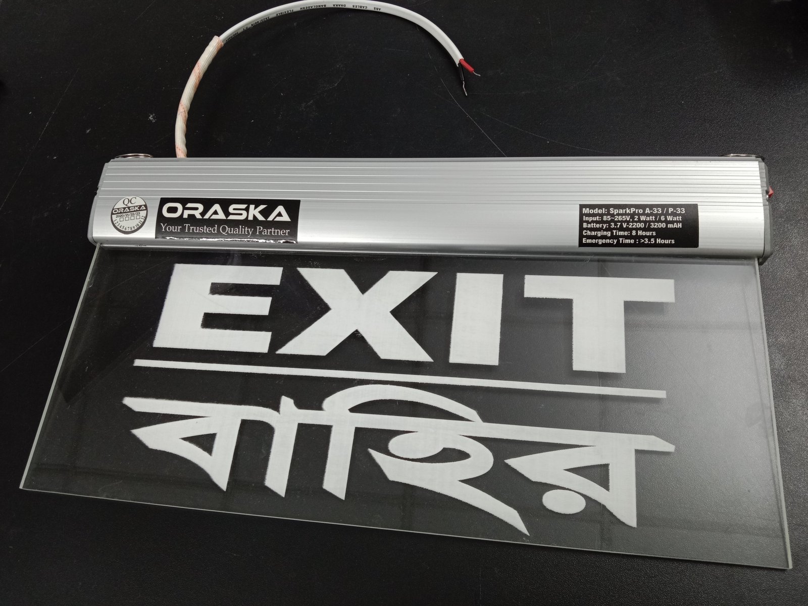 The ORASKA SparkPro A-33 Clear Exit Sign Light is a compact, premium-grade emergency signage solution, crafted with precision for modern safety compliance. Its single-sided clear engraved acrylic panel with aluminum channel body ensures sleek design, high durability, and crystal-clear visibility.
