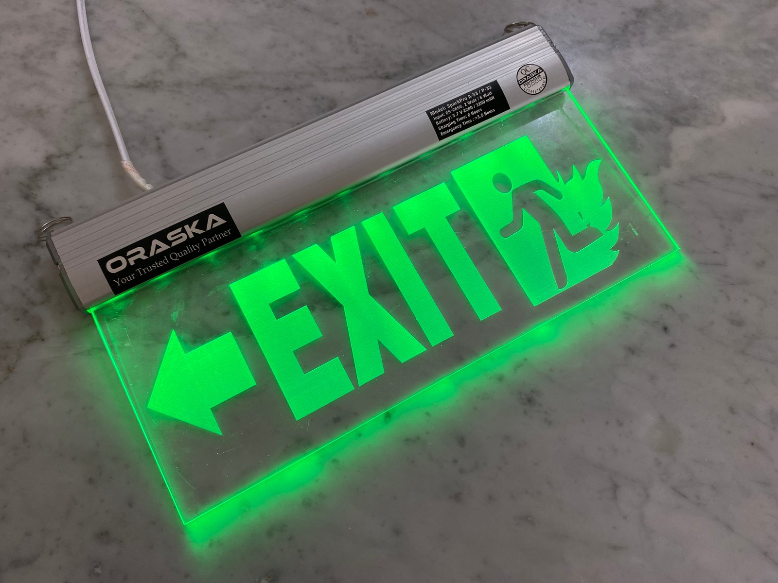 The ORASKA SparkPro A-33 Clear Exit Sign Light is a compact, premium-grade emergency signage solution, crafted with precision for modern safety compliance. Its single-sided clear engraved acrylic panel with aluminum channel body ensures sleek design, high durability, and crystal-clear visibility.