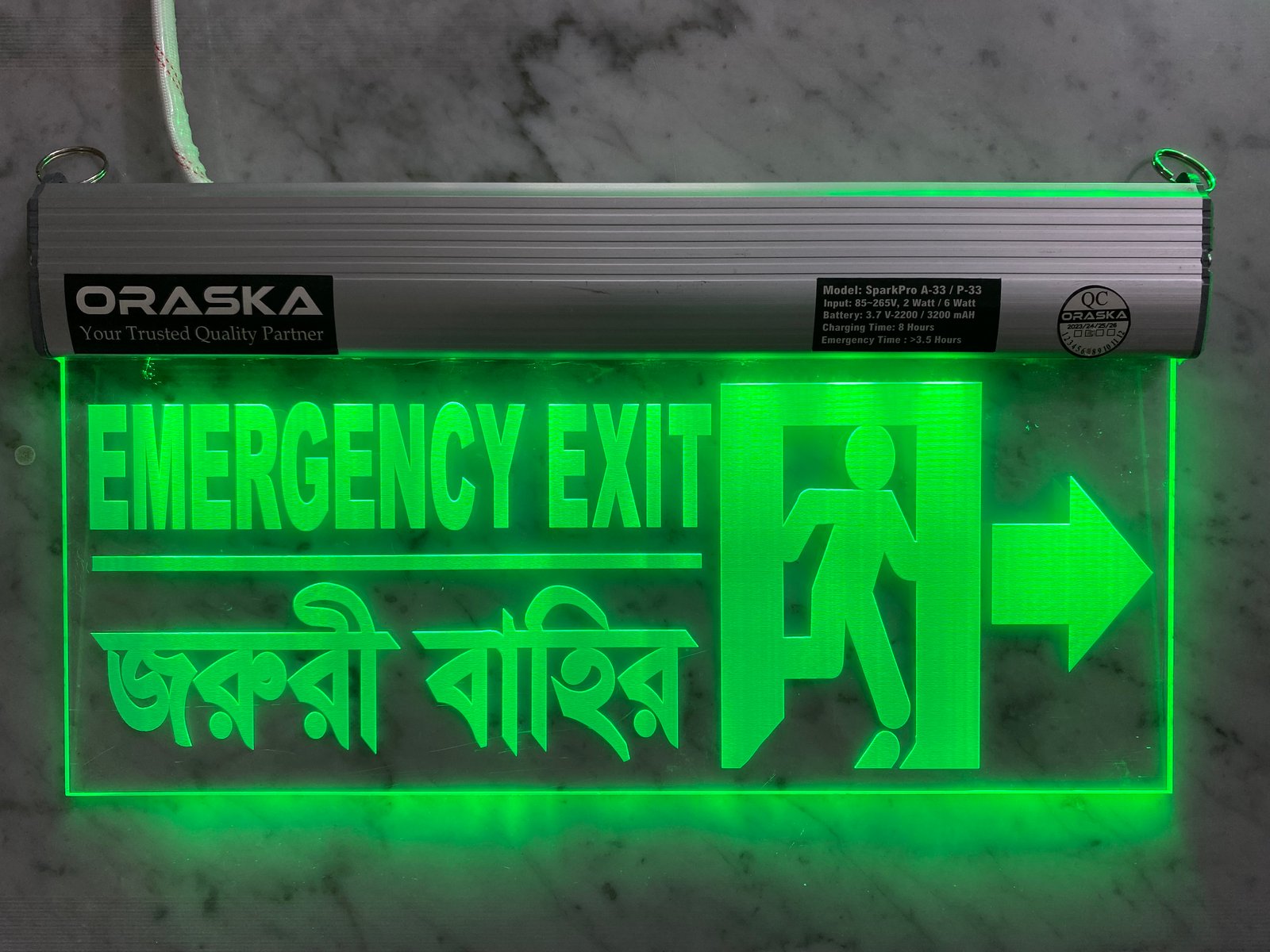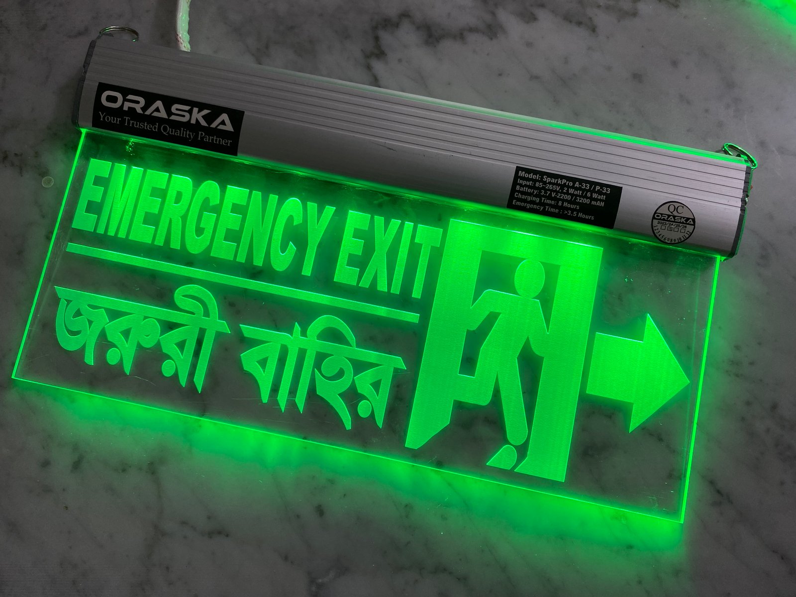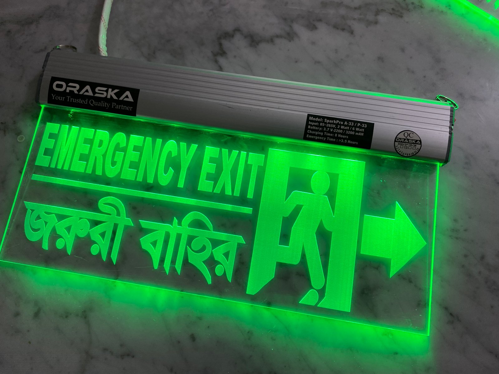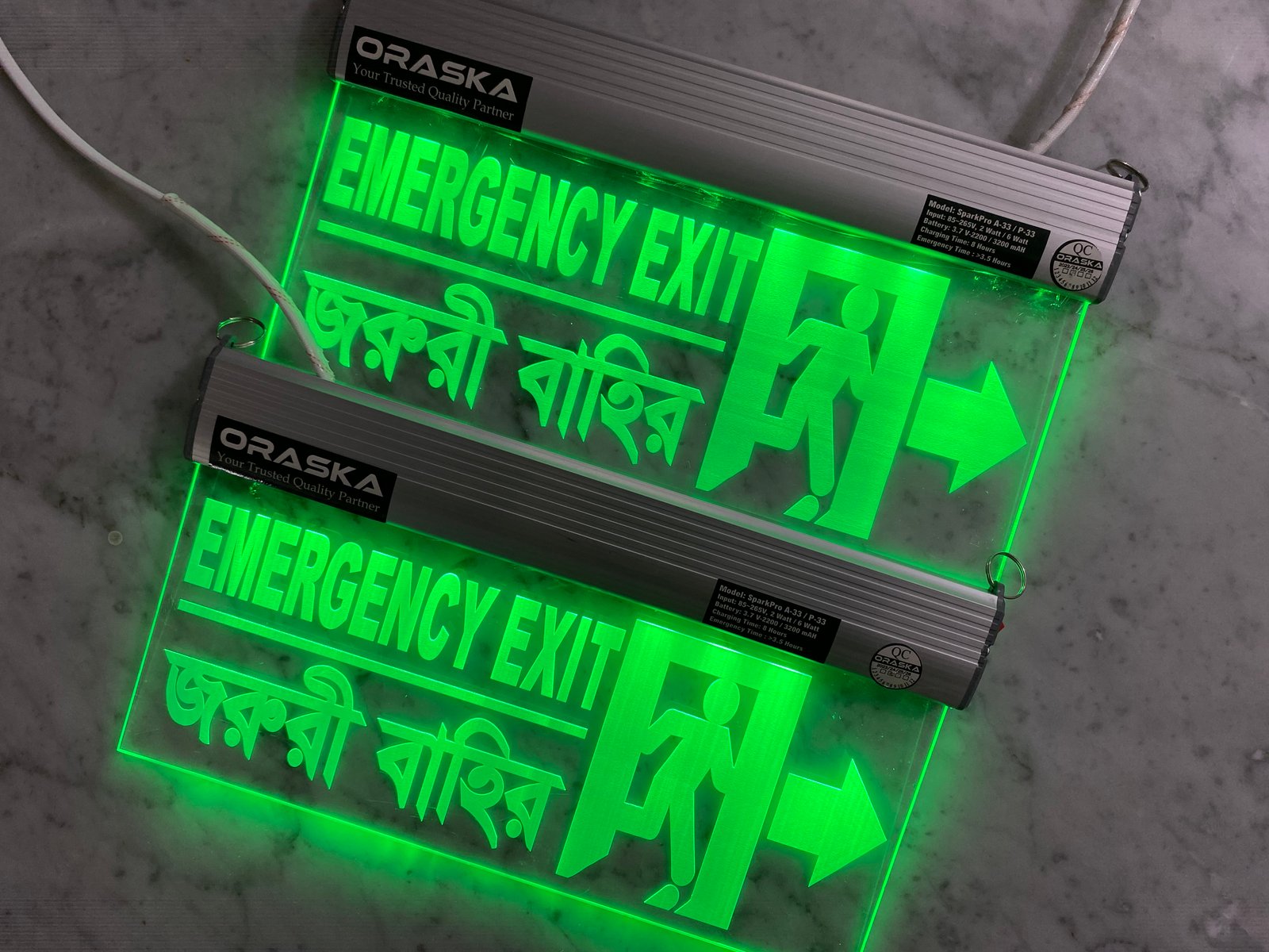 The ORASKA SparkPro A-33 Clear Exit Sign Light is a compact, premium-grade emergency signage solution, crafted with precision for modern safety compliance. Its single-sided clear engraved acrylic panel with aluminum channel body ensures sleek design, high durability, and crystal-clear visibility.