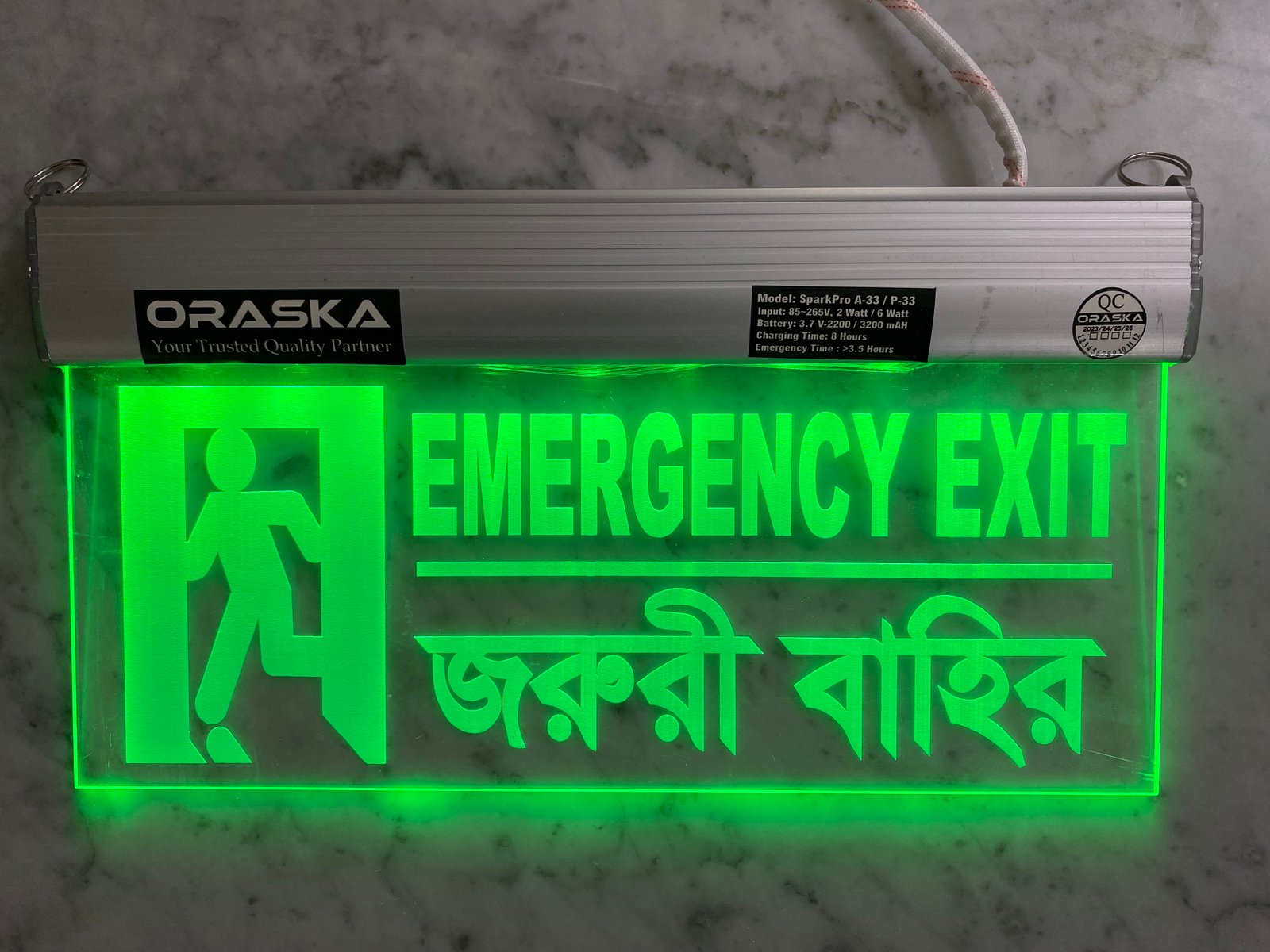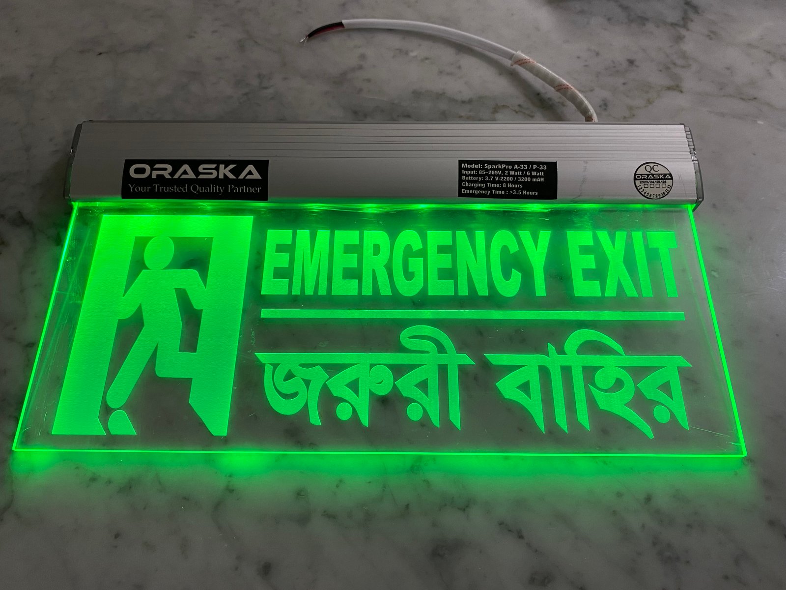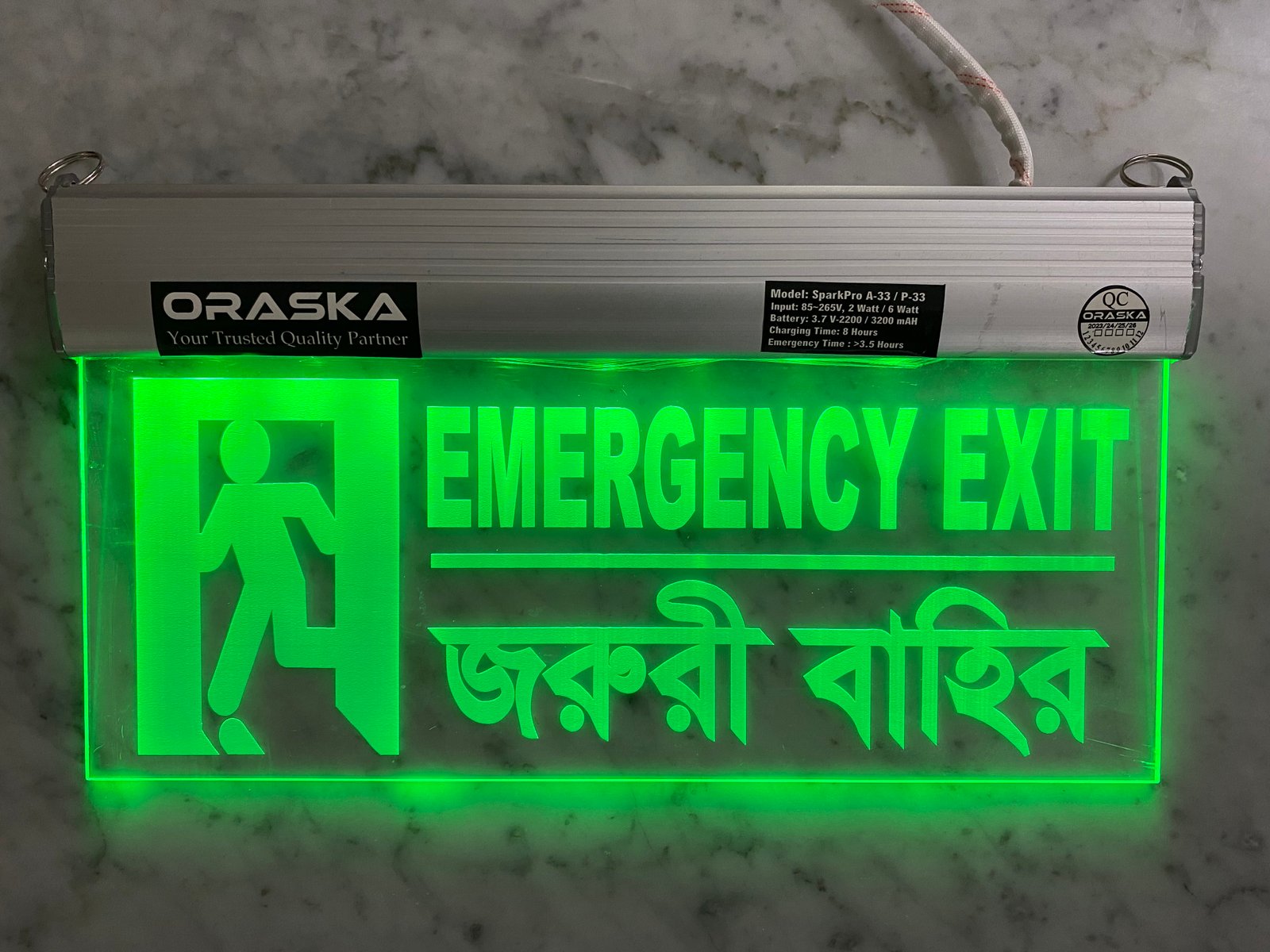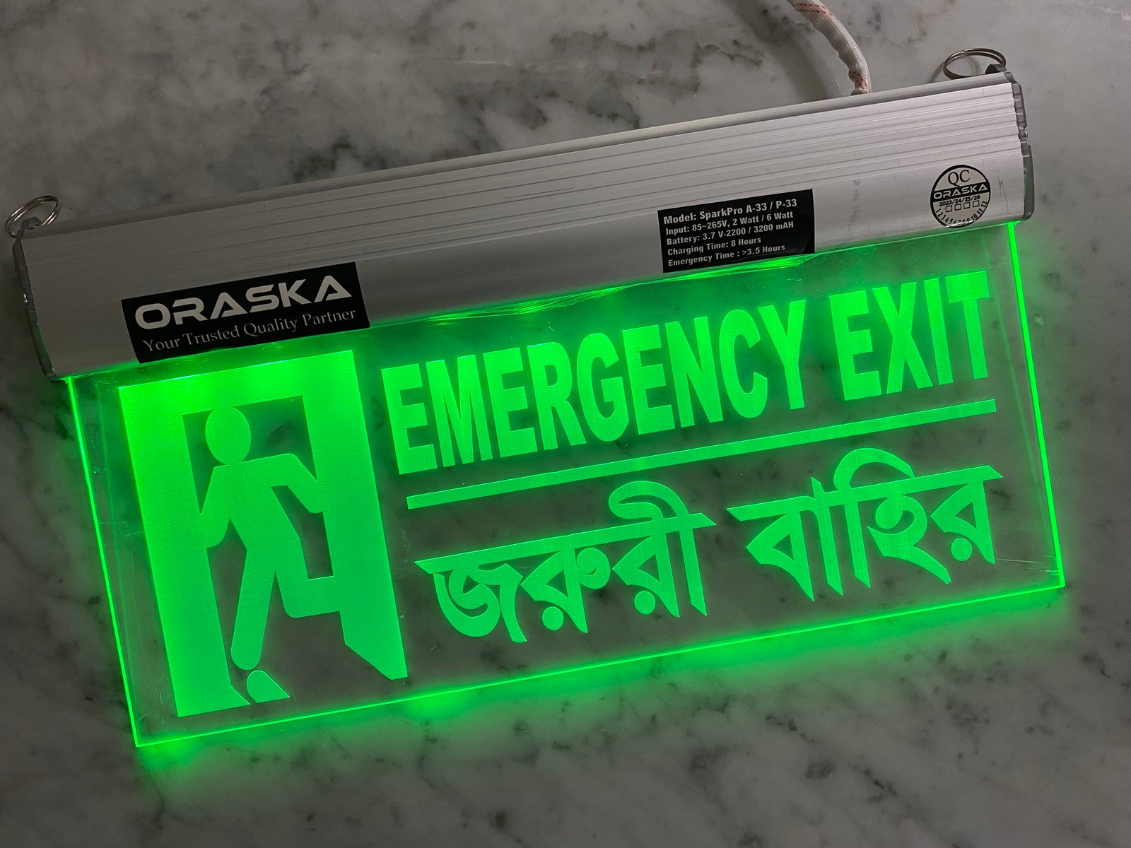 The ORASKA SparkPro A-33 Clear Exit Sign Light is a compact, premium-grade emergency signage solution, crafted with precision for modern safety compliance. Its single-sided clear engraved acrylic panel with aluminum channel body ensures sleek design, high durability, and crystal-clear visibility.